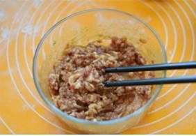 将买来的新鲜肉剁成肉馅,加入料酒,盐,酱油,鸡精等调味料搅拌均匀,放置一会儿。