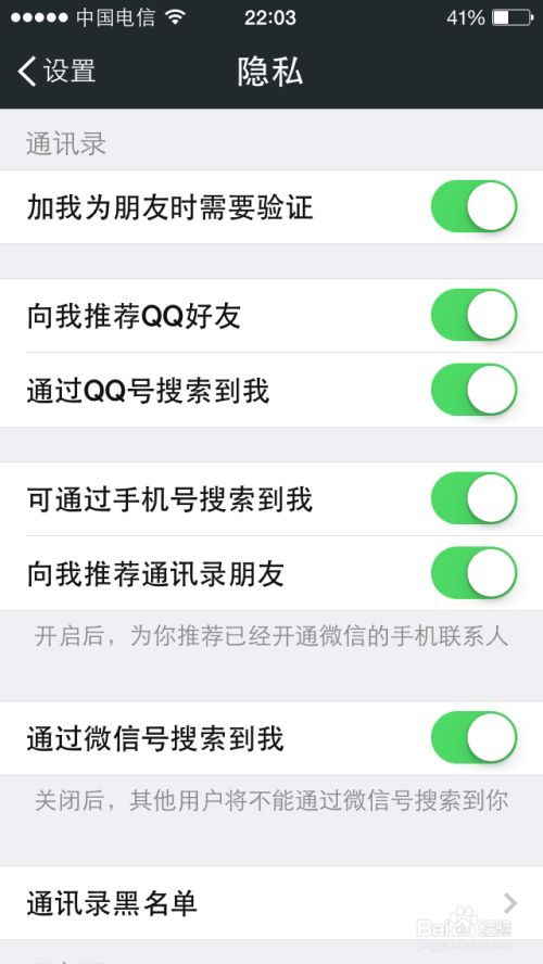 点击隐私,进入到隐私页面,可以开启加好友需要验证,黑名单等功能,根据自身需要开启或者关闭就可以了。