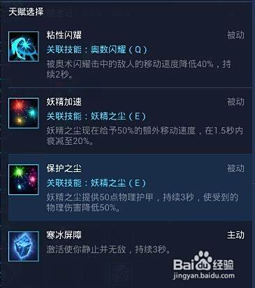妖精之尘可以额外提供50点的物理护甲,使收到的物理伤害降低50%,很好的保护技能,如果是自己太容易被击杀的话可以选择寒冰屏障!
