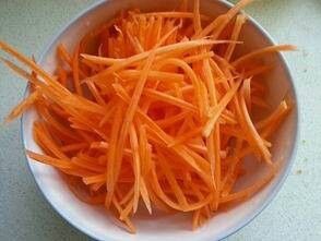 将小葱、胡萝卜切成细丝放在碗中备用。