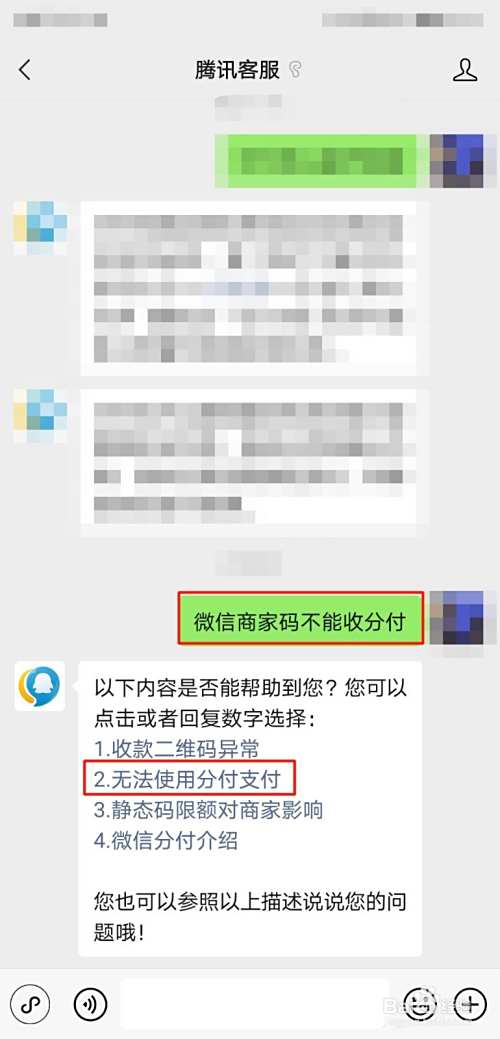 在对话框中输入“微信商家码不能收分付”,在回复的信息中选择“2.无法使用分付支付”。