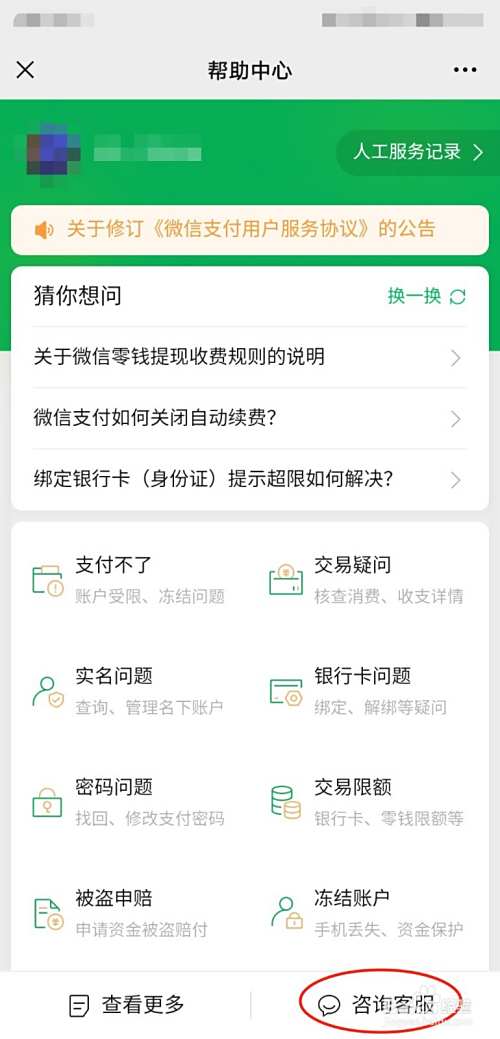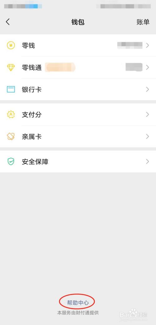 在微信钱包底部,选择“帮助中心”。