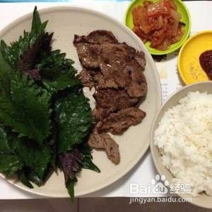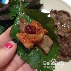 用紫苏叶包牛肉和泡菜挤上辣椒酱就完成了