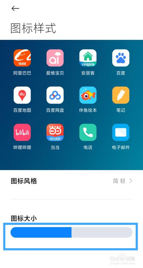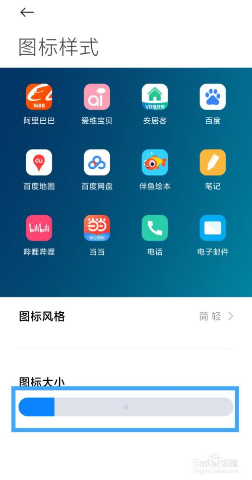 滑动图标大小的设置条块,向左滑动则减小图标,如图所示。