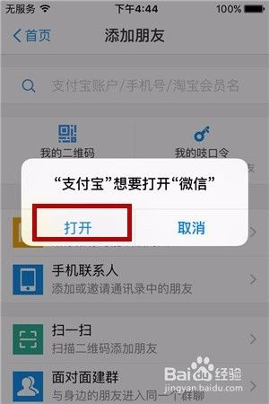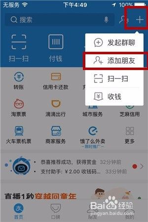 在支付宝首页,点击右上角的“+”按钮,在弹出的下拉菜单中,点击“添加朋友”
