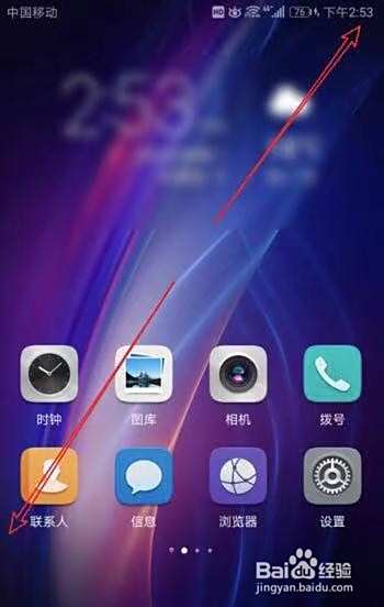 华为手机桌面,两个手指分别向屏幕的两角滑动。