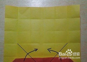 然后把纸按照折痕折叠成图中所示,再把下侧在白色虚线处折上去。