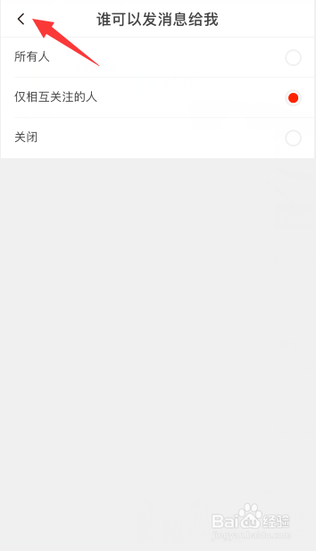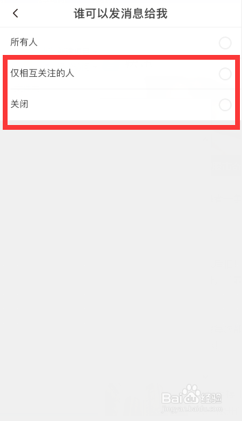 3、可以选择“关闭”,不接收私信,或者选择“仅相互关注的人”可以发私信