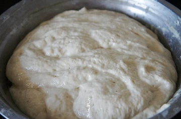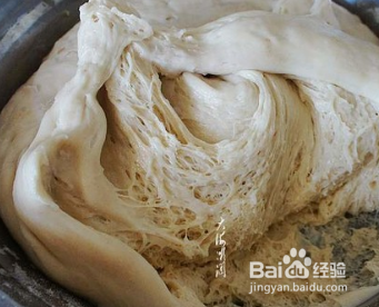 头一天晚上将面粉加入适量的温水,用筷子搅拌均匀,喜欢甜的加适量的白糖,加白糖还能促进发酵速度,略稀一点可以不成面团,盖上保鲜膜,放在温暖的地方自然发酵,这是第二天早上发酵好面团