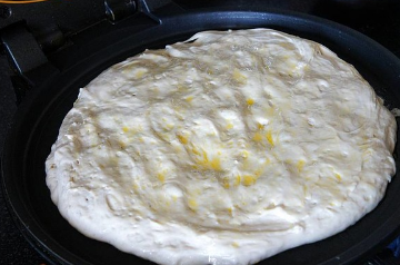 电饼铛上下火中档预热,薄薄的刷一层油,将饧好的面直接倒入电饼铛,上边用刷子少许刷点油或者给上盖薄薄的刷层油,盖上电饼铛上盖,大约2-3分钟就OK 啦