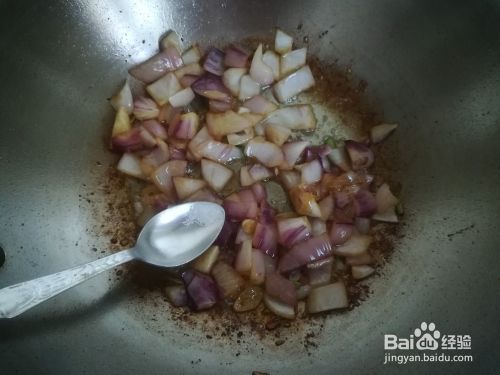 再把切好的葱头块入锅,快速翻炒至发软,这里不要炒的时间太长了,否则就不脆而且也不好吃了。