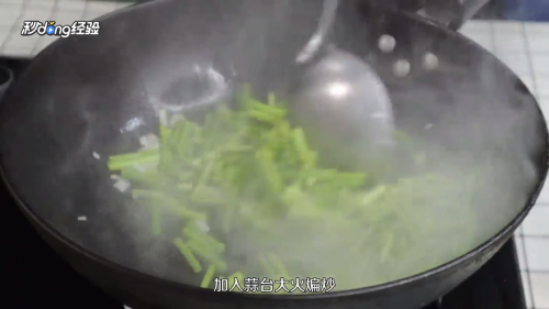 加入蒜苔大火煸炒。