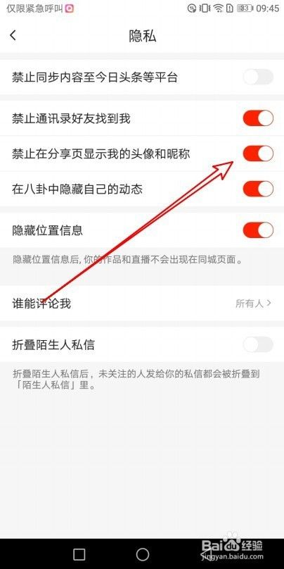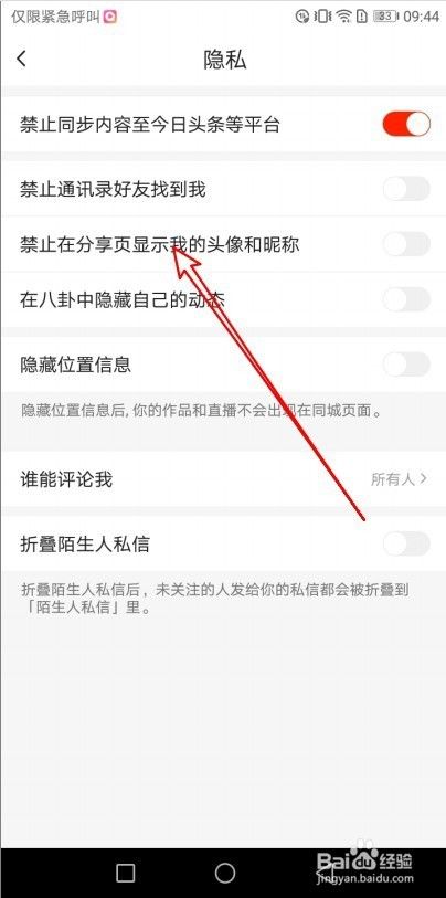 然后会打开隐私的设置页面,在页面中找到“禁止在分享页显示我的头像和昵称”的设置项。
