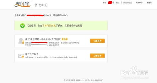 如果顺利的话,就会弹出以下界面,我们可以选择“电子邮箱+证件号码+支付密码”的方式进行修改支付宝账户,也可以通过人工服务进行修改。