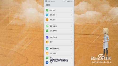 在华为手机的设置界面中,找到桌面和壁纸,点击它进入。