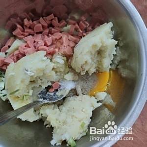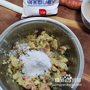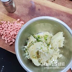 将土豆切块蒸30分钟,用勺子压成泥,将葱花,香肠切丁