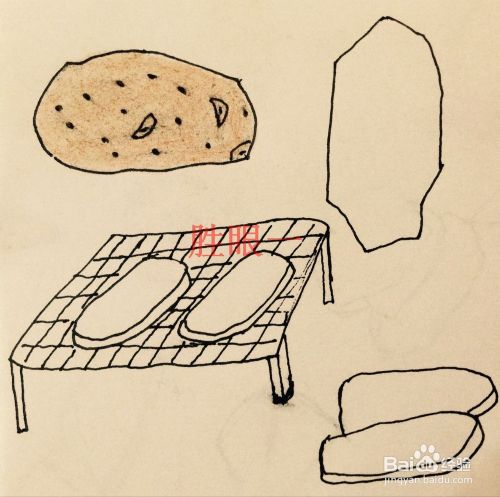 我们这幅画的布局是,画纸的上半部分的左边画上一个整个的带皮的土豆,画纸的上半部分的右边画一个刮干净外表皮的土豆,画纸的下半部分的左边,画一个烤网,上面摆着两片切好的土豆片,画纸的下半部分的右边画两片切好的土豆片。