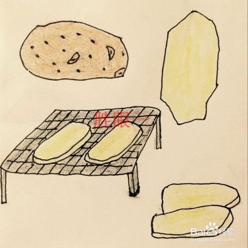 我们在画纸的下半部分的左边的画好的两片切好的土豆片的下面画上烤网。