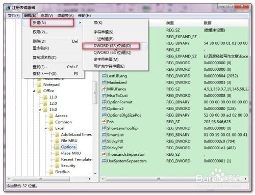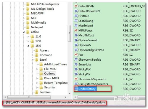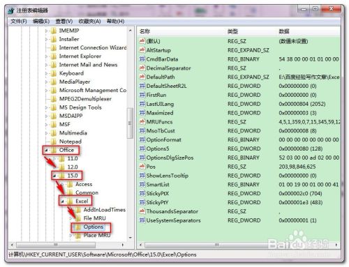 依次展开“我的电脑\HKEY_CURRENT_USER\Software\Microsoft\Office\15.0(根据版本不同而不同,本人为Office2013,所以15.0,其他的版本依次减1)\Excel\Options”