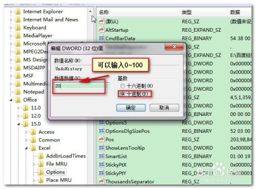 双击此DWord值,弹出编辑DWord值对话框,将“基数”设置为“十进制”,数值数据设置一个0~100的值。这个值就是Excel中允许撤消的步数,可以根据自己情况设置。确定退出就可以了。