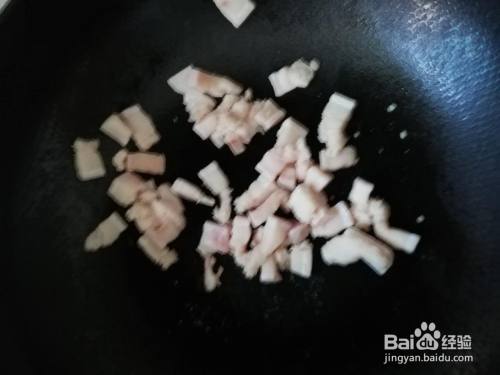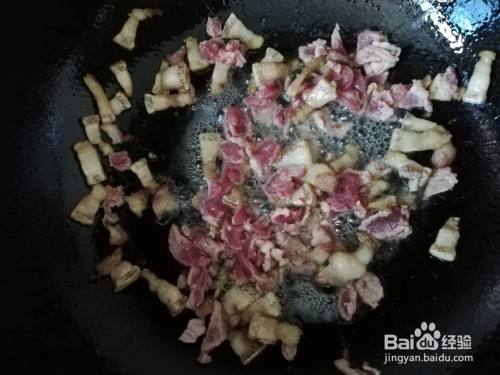 锅烧热,加入适量油,把切好的肥肉放入锅中煸炒