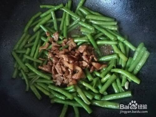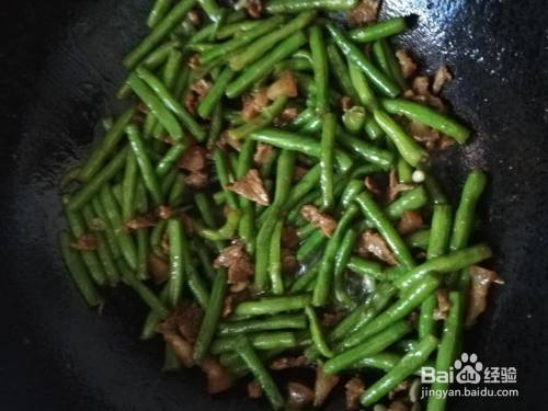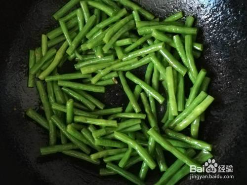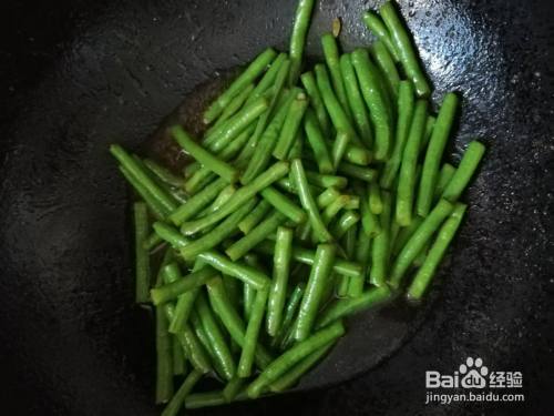 锅中加少许油,豇豆放入锅中翻炒,加入一勺水烧至豇豆断生