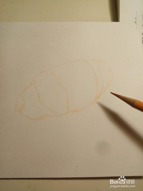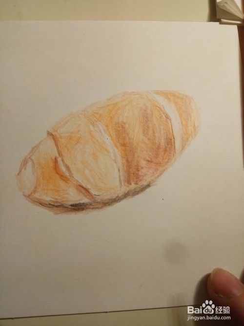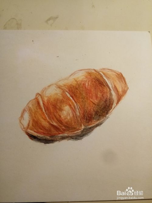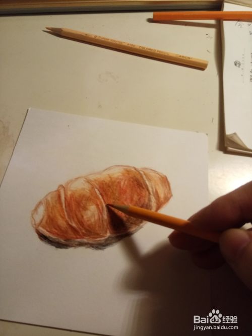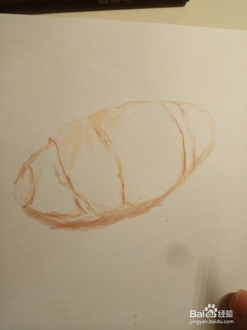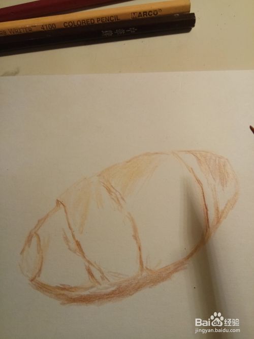 勾勒完以后,我们就用橘色彩铅,用斜擦的方法,把面包的体积感给,画出来,