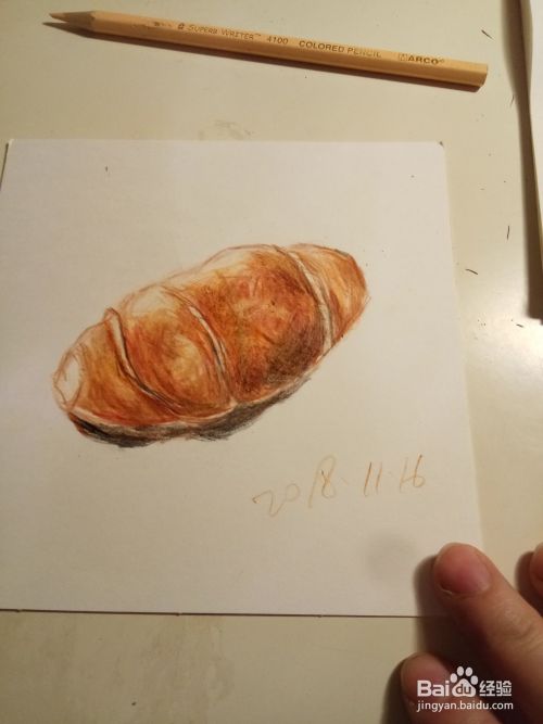 用白色笔在高光部分进行,图画,也可以用橡皮,轻擦,以表现高光部分,这样,我这只牛角面包就画好了,写上日期签名,就完成了。