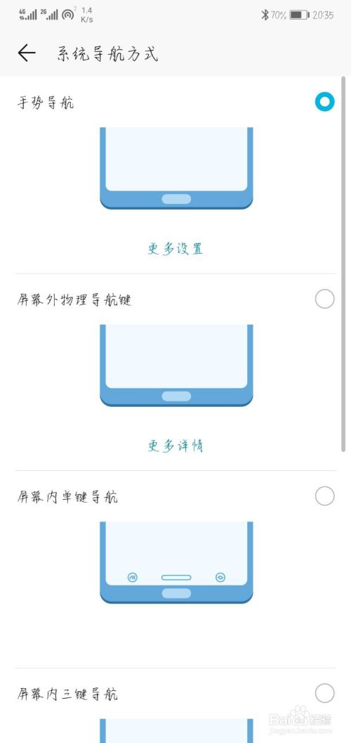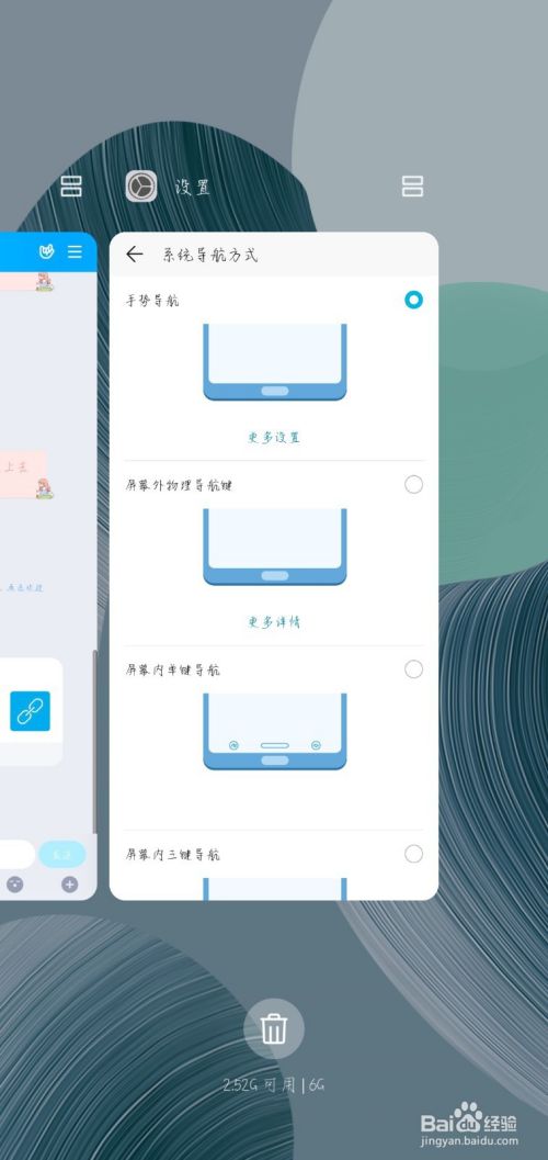打开进入可以看到多种导航方式,有手势导航,悬浮导航等等,我们打开手势导航。设置成功后退出到主页面。