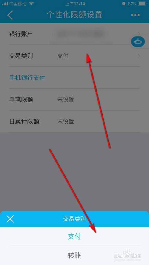 在个性化限额设置中,找到交易类别,点击交易类别进行选择。