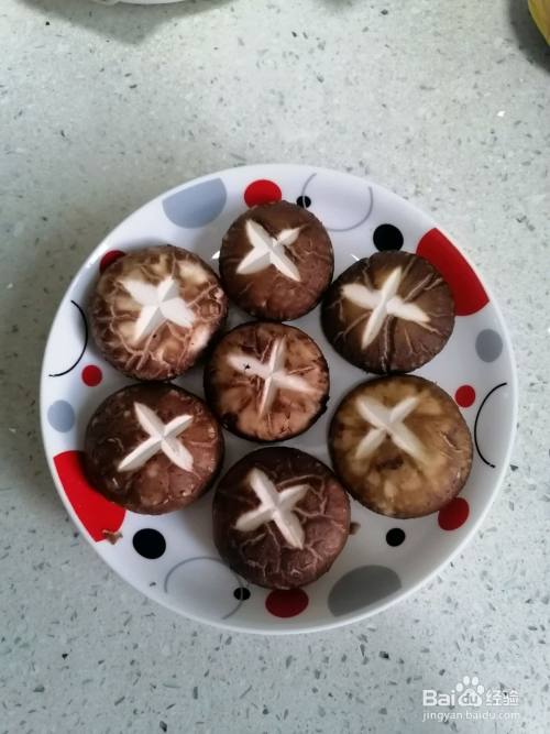 香菇洗净控干水分,正面划十字花道,便于入味,备用