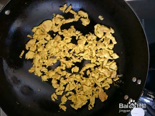 鸡蛋打发后,热锅大火下锅,用筷子迅速搅拌,打成蛋碎碎,冷凉,用手捏碎渣渣,备用。