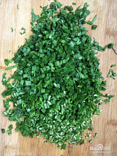 韭菜切碎,韭菜梗切小一点,韭菜叶切大一点半厘米左右。
