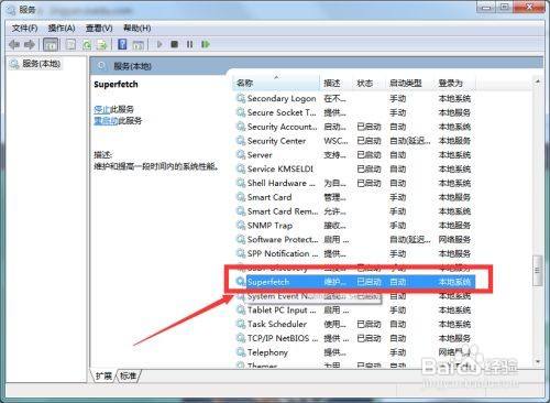 第二步:然后找到“服务”,再右侧栏找到“superfetch”双击进入,如图所示,如图所示