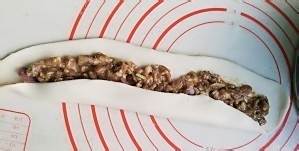 取一个面团,擀成长一点的椭圆形,把馅料铺在上面;一边往拢包裹住肉馅;