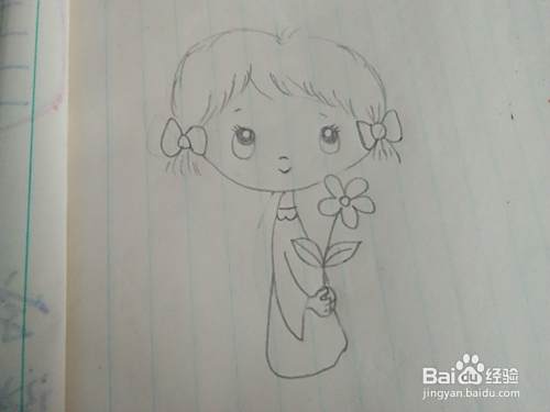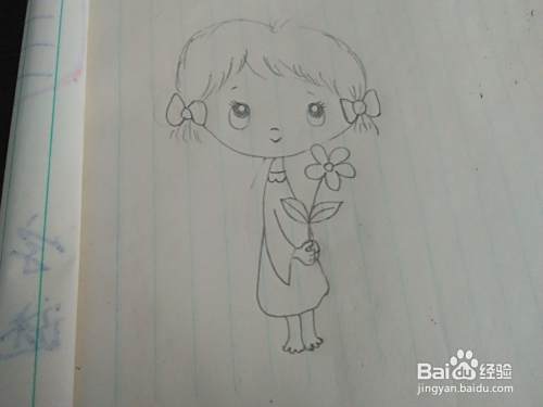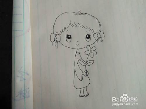 我们再把女孩的手里画出一枝花来,再把女孩的小脚丫画好。