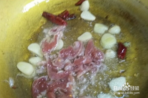 起锅烧油,先放入生姜、大蒜、干辣椒炒香,下入腌好的肉丝。