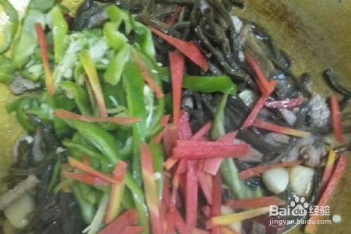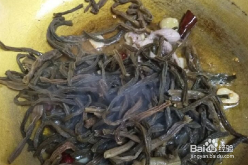 翻炒三分钟至肉丝变色,放入干豆角翻炒两分钟。