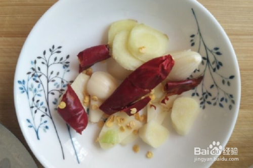 2、起锅烧油,先放入生姜、大蒜、干辣椒炒香,下入腌好的肉丝。