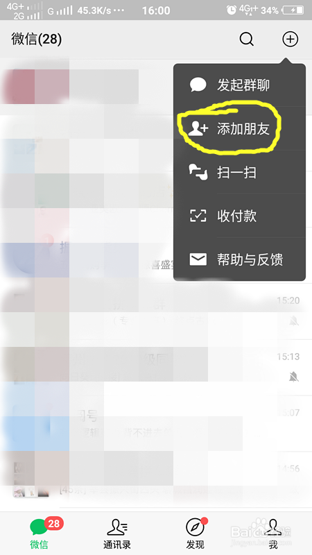 点击右上角的加号以后,在弹出的选项中我们选择添加朋友,进入添加的界面。