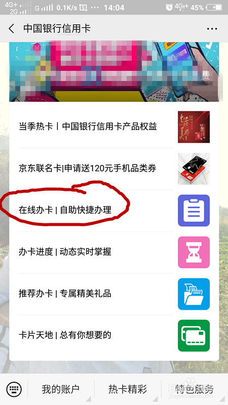 这个公众号就会给你发一条消息,上面有一个办卡,我们点击办卡即可。