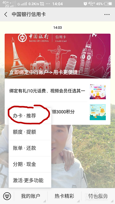 我们关注这个公众号以后,我们选择下方的我的帐户,在弹出的界面里面点击办卡。