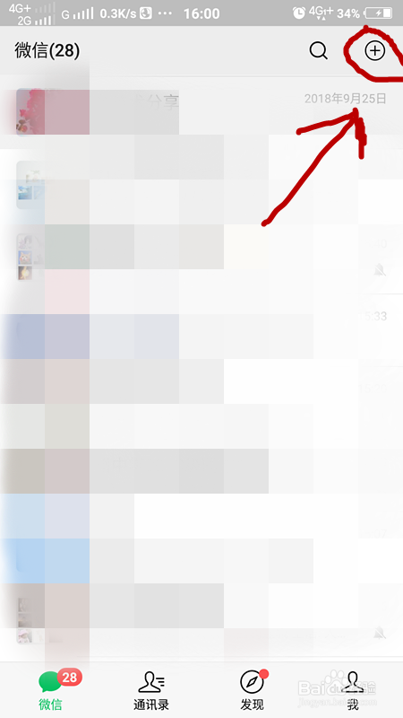 我们首先打开我们的微信,进入微信的首页,点击微信右上角的加号。