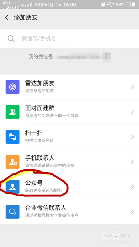 在添加朋友的界面,我们在最下方找到公众号,选择公众号。