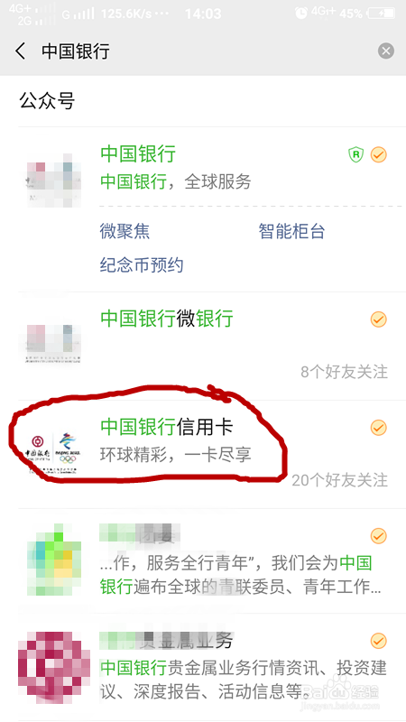 我们以中国银行为例,搜索中国银行公众号,会看到一个中国银行信用卡,我们点击关注。