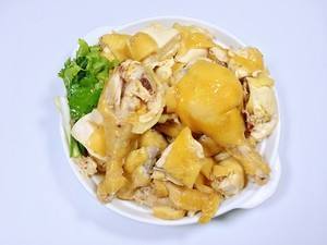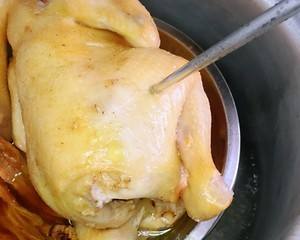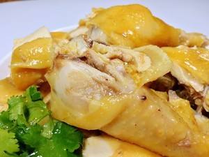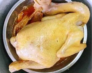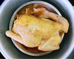 这就是隔水蒸鸡啦。稍微放凉后就可以取出砍块,或者也可以直接手撕来吃,