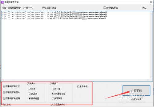 8.复制好后,选择好下面的设置,比如“下载买家秀文字”、“下载买家秀视频”、 “SKU属性名称”、“生成表格”等等,并单击立即下载,如图: