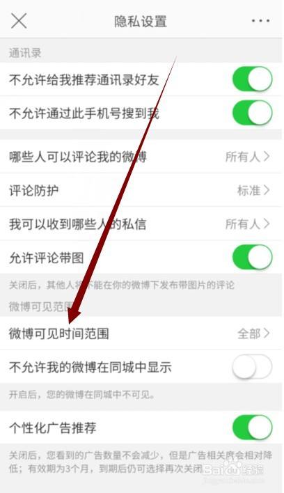 4、在隐私设置中,我们再点击进入【微博可见时间范围】的设置。