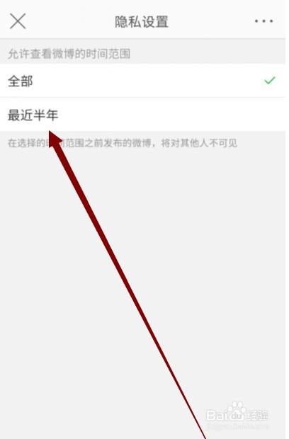 5、最后我们点击设置微博可见时间范围,可以设置全部或者只显示最近半年,如图所示。