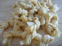 百叶结是用豆制品薄百叶打结而成,烹制豆制品一般都需要有肉类的油水,家里有剩下的肉汁水,用来烧百叶结是最好的啦。